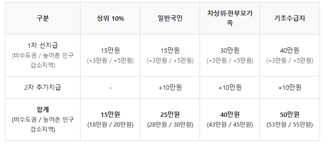 | 취약계층형 | 기초생활수급자, 한부모가족, 다문화가정 등 | 추가 10만원 소비쿠폰 지원 |