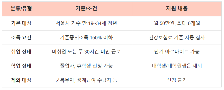 신청 대상은 신청일 기준 만 19세 이상 만 34세 이하이며, 서울시 내 주민등록이 되어 있어야 합니다. 동시에 현재 미취업 상태여야 하며, 고용보험 가입 이력이 없거나 주 30시간 미만의 단기 근로자만 지원이 가능합니다. 기준중위소득 150% 이하 가구의 구성원이어야 하며, 소득은 건강보험료 납부 내역 등을 통해 확인됩니다.