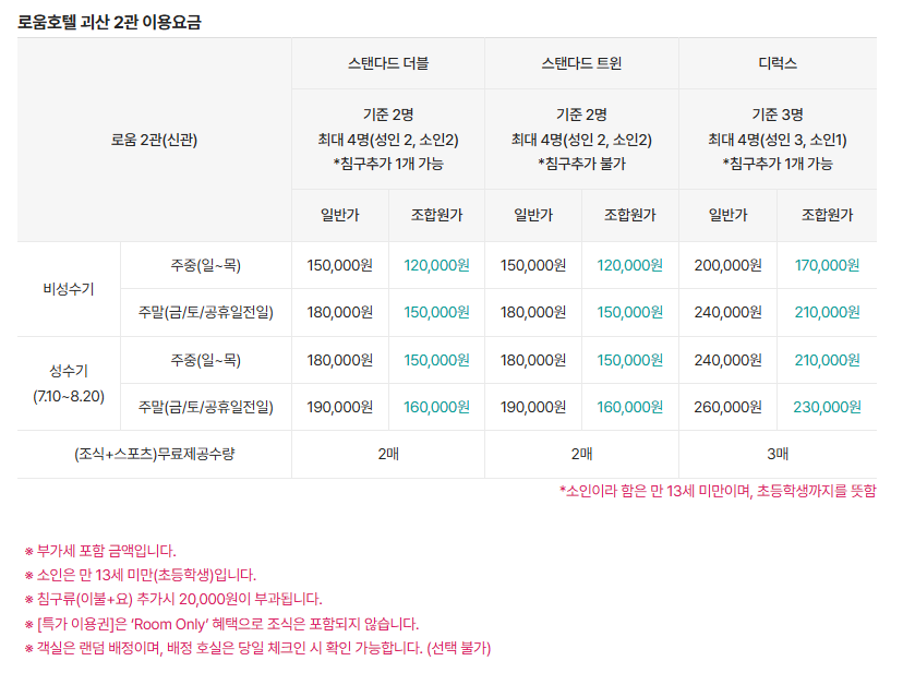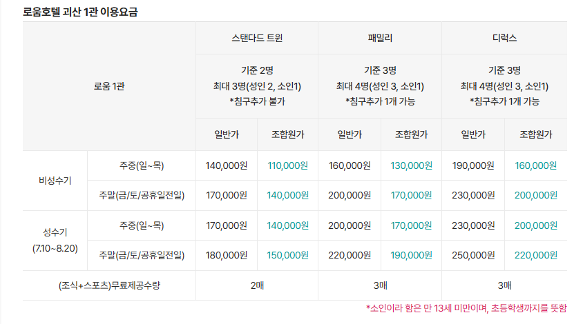 괴산 자연드림 숙소의 금액은 숙소 유형, 성수기 여부, 조합원 여부에 따라 달라집니다.